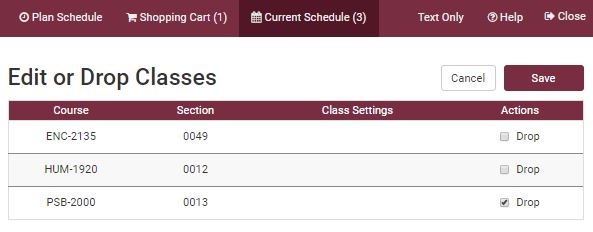 NOTE: You may only drop classes in Schedule Assistant while registration remains open and before the end of drop/add (midnight on the fourth day of classes). After drop/add has ended you may only request course drops with Student Central. Instructions on course drops in Student Central are available here.