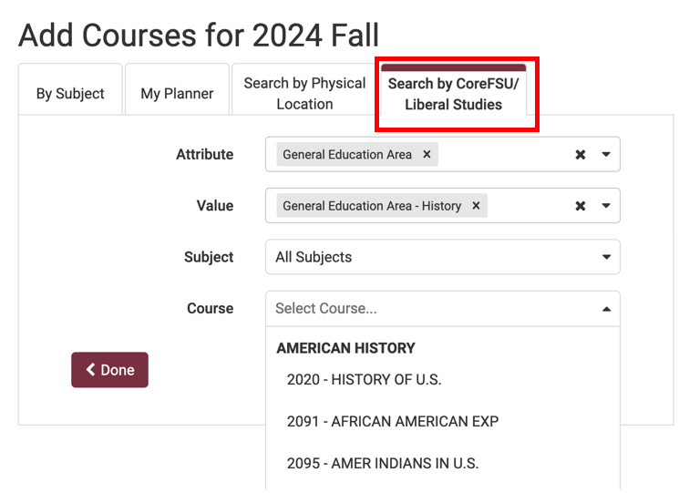 To search for courses by Liberal Studies area, click the Add Courses button and then select the Search by CoreFSU/Liberal Studies tab. Use dropdown fields for Attribute and Value to select the Liberal Studies area(s) you for which want to find courses.