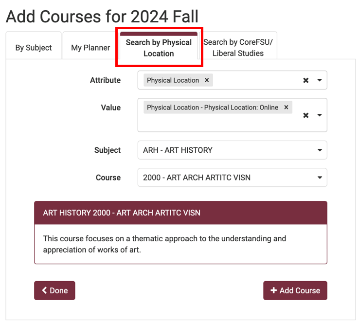 Click the Add Courses button and navigate to the Search by Physical Location tab. In the Attribute field enter Physical Location and in the Value field enter the physical location for the classes you want to take. Search for the course by subject and course number/title and add the course(s).