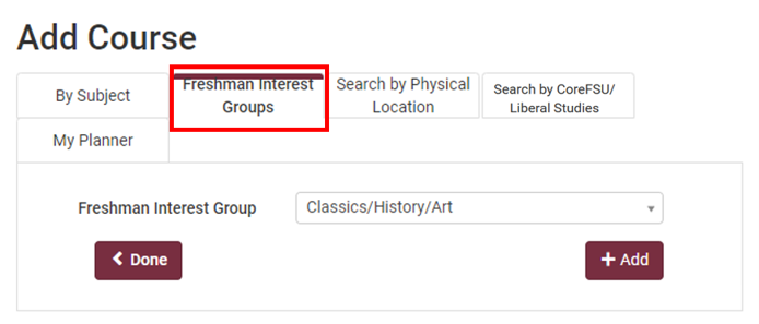 For incoming freshmen, a Freshman Interest Groups tab will be available to you under the Add Courses function. From this tab you can scroll through the list of FIG offerings from the drop down menu, add the FIG you want to take, and proceed to register.