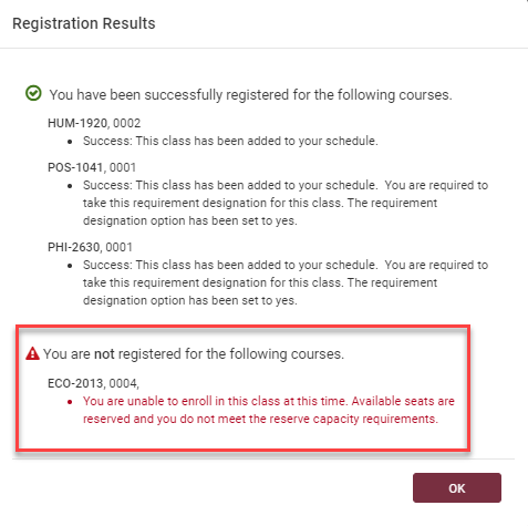 You were not able to enroll for any classes that appear beneath the red exclamation point icon. Review the red error message beneath these classes to learn why your enrollment was not successful.