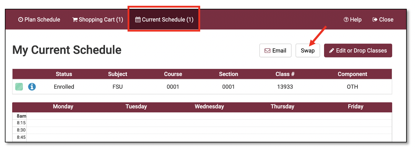 On the Current Schedule tab you will find the courses you are enrolled in. Click the Swap button on the right side of the page.
