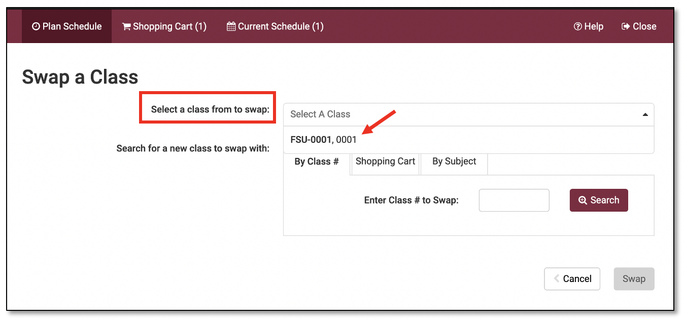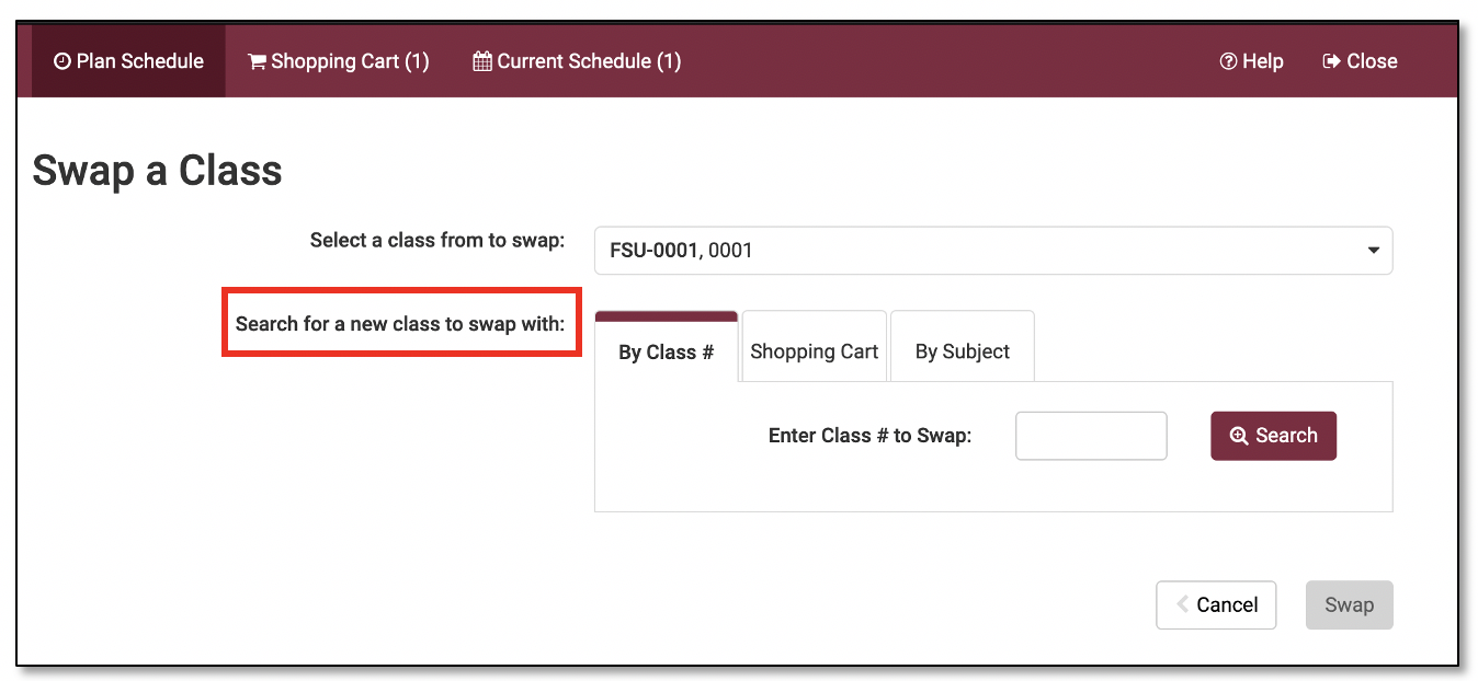 There are three tab options you may use to search for the new class you want to swap into: By Class #; Shopping Cart; or By Subject.