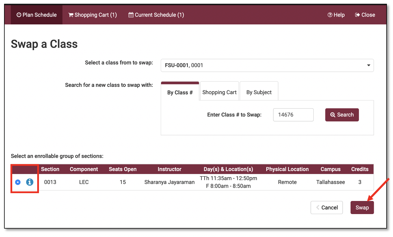 The class section will populate in the space below. Select the class by checking the button on the far left. Click the Swap button and follow the online instructions to proceed with the rest of the swap.