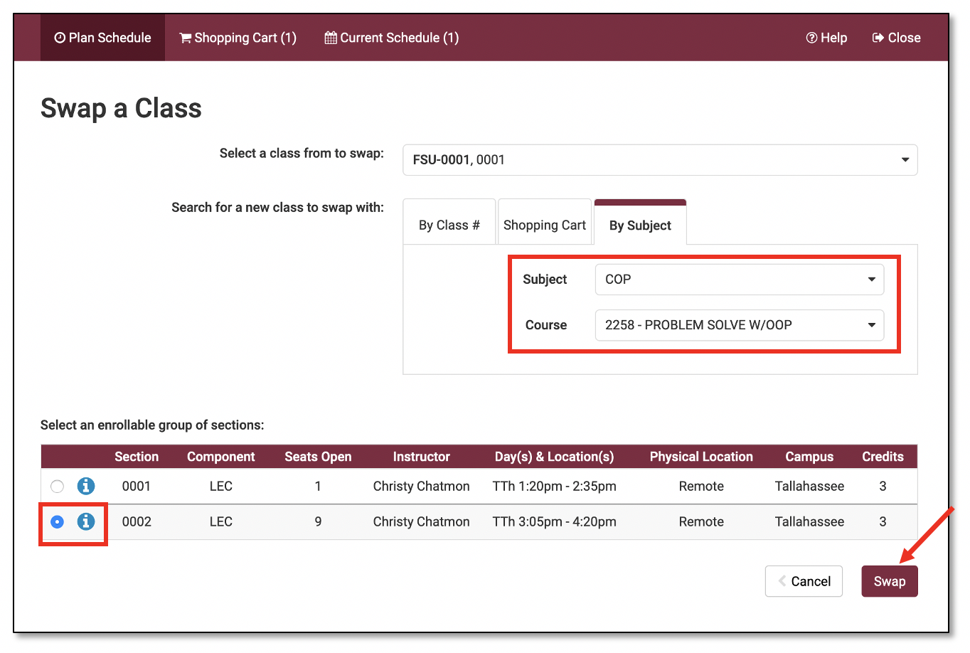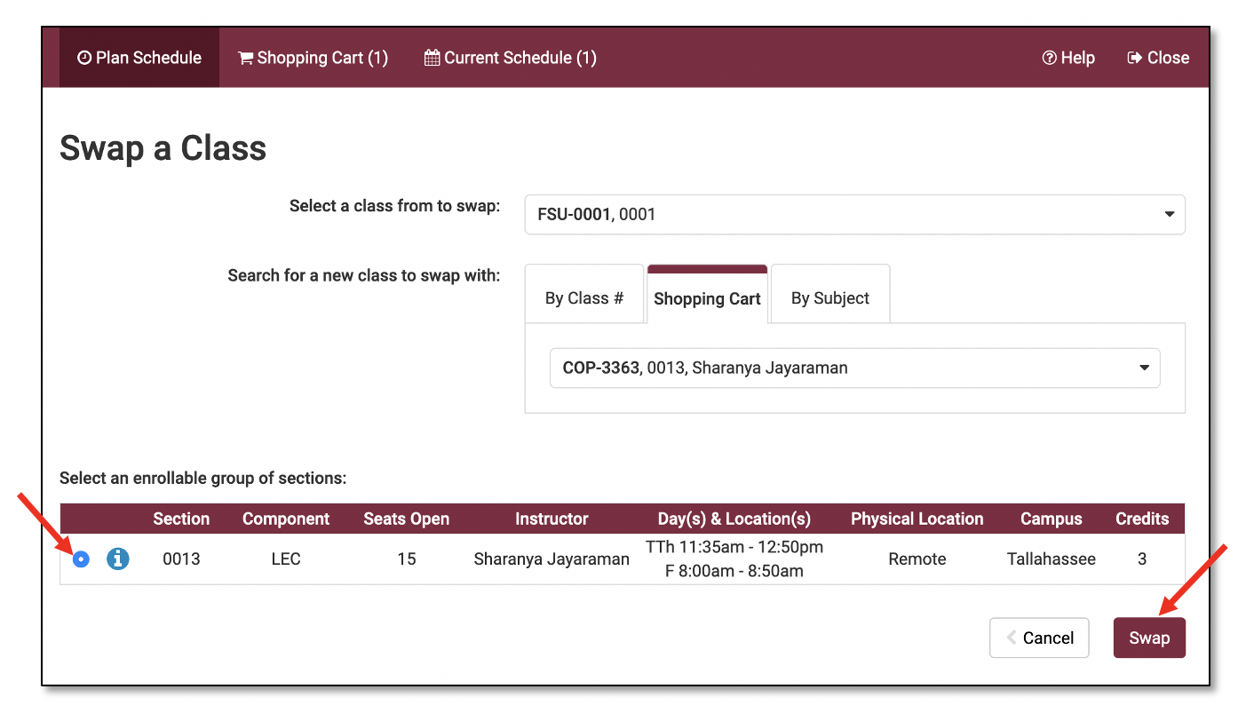Use this tab if the class you want to swap into is already in your Shopping Cart.