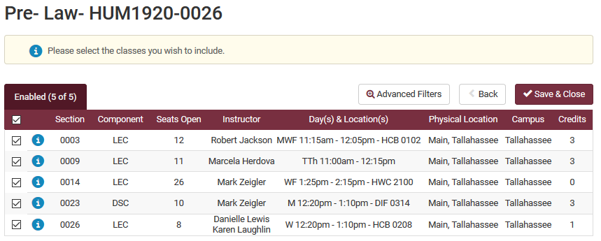 The only sections that will appear in the results are the ones that match the location that you selected in the Physical Location tab. All sections in other locations will be Disabled. Click Save & Close and continue with Generating Schedule options and registration.