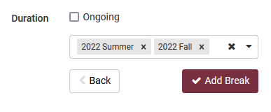 If you have a break that needs to extend for more than one semester, use the Duration fields to indicate how long the break should be in effect. Use the dropdown box to apply the same break to one or more specific terms. Alternately, click the Ongoing checkbox to apply the break across all current and future terms.