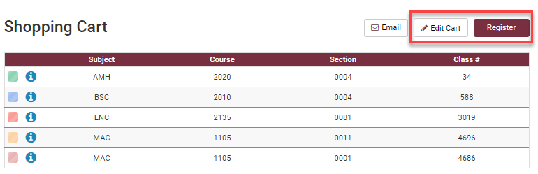 Click the Edit Cart button if you need to remove a class from the schedule.