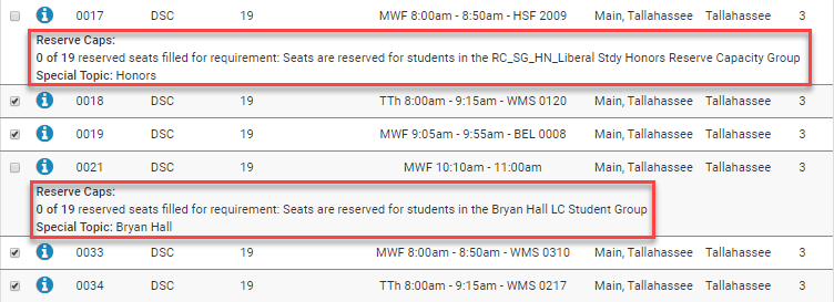 Check for any sections on the list that have a Reserve Caps or Special Topic note. These sections may be reserved for students in a certain population or program, and only students in those programs will be eligible to register for these sections.
