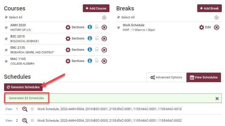 Click Generate Schedules to view all possible schedules for the classes you selected. Schedule Assistant will generate a list of all the schedule combinations possible for the courses/sections you selected and that work around your breaks.