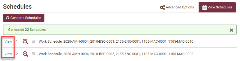 Click the View link to review details for a specific schedule combination.