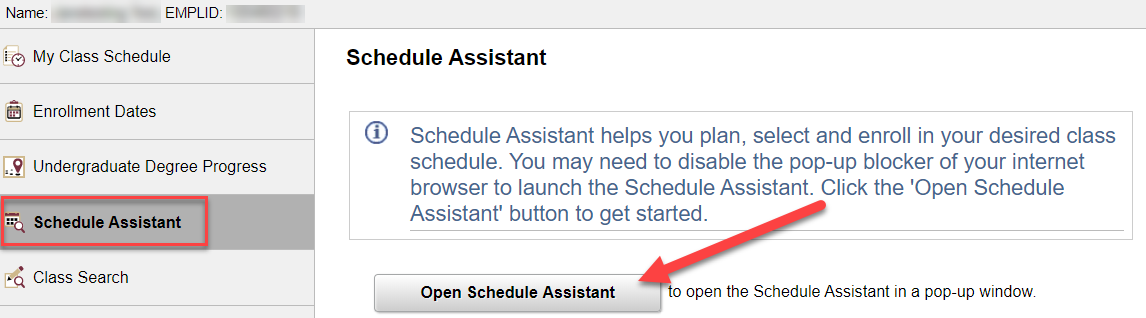 Click the grey button to Open Schedule Assistant. The page will open in a new tab. If Schedule Assistant does not open, make sure the pop-up blocker on your browser is turned off and then try again.